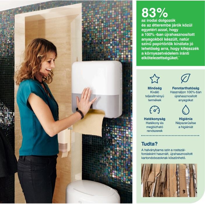 A kéztörlő- és toalettpapír-töltőanyagok új kínálatával Ön könnyen kifejezheti a mosdóhelyiségekben vállalata fenntarthatóság iránti elkötelezettségét.