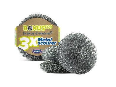 A Bonus fémsúroló 3 darabos kiszerelésben kapható. Ez egy erős dörzsi, mely a makacs szennyeződések eltávolítására alkalmas edényekhez és más felületekhez.