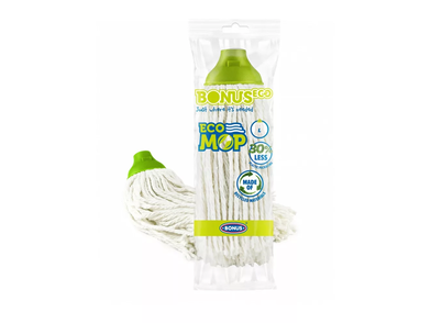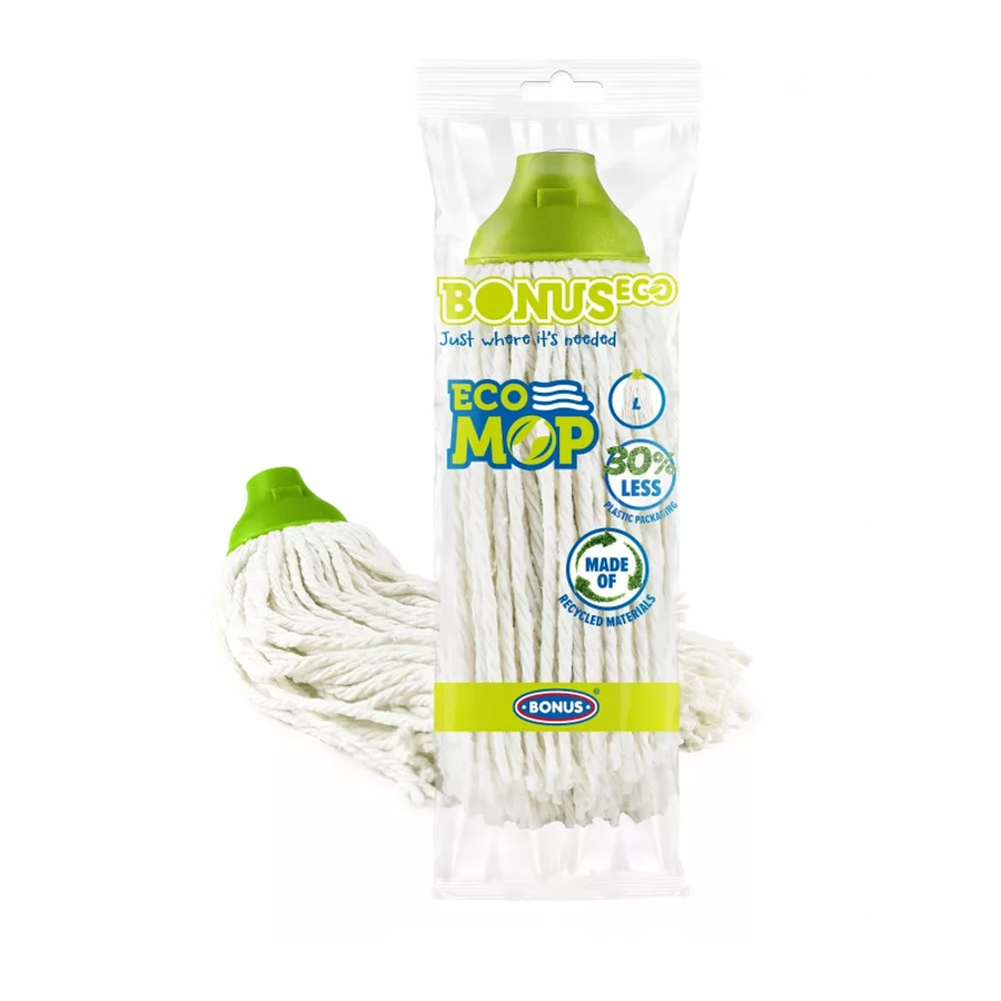 Újrahasznosított 40% pamut valamint 60% poliészter és viszkóz keverékből készült felmosófej. Csökkentett falvastagságú csomagolásban. Gazdaságos méret.
