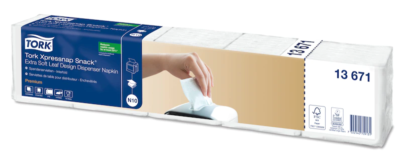 A Tork Xpressnap Snack® Premium szalvétákat önkiszolgáló éttermekbe terveztük, mivel ott a kisméretű szalvéta is elegendő. Ezzel a megoldással legalább 25%-kal csökkenthető a felhasznált szalvéták mennyisége a hagyományos szalvétaadagolókhoz képest. A 2 rétegű Tork Xpressnap Snack® Extra Soft levélmintás adagolós szalvéta tökéletes választás olyan létesítményekbe, ahol fontos a kényelem és a minőségi légkör. Ez a vastag, igényesen kialakított snackszalvéta éppen ezt nyújtja.