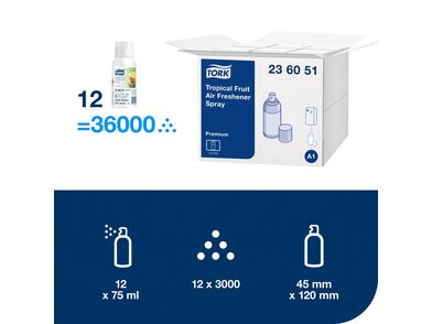 Kezelje eredményesen és hatékonyan a kellemetlen mosdóhelyi szagokat a Tork citrusos illatosító spray-vel. A spray koncentrált illóolajat és saját fejlesztésű szagsemlegesítő anyagokat tartalmaz, így megszünteti a kellemetlen szagokat, és hosszan tartó, friss illatot biztosít. A spray a Tork illatosítóspray-adagolóval együtt használható.