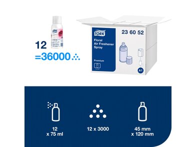 Kezelje eredményesen és hatékonyan a kellemetlen mosdóhelyi szagokat a Tork virágos illatosító spray-vel. A spray koncentrált illóolajat és saját fejlesztésű szagsemlegesítő anyagokat tartalmaz, így megszünteti a kellemetlen szagokat, és hosszan tartó, friss illatot biztosít. A spray a Tork illatosító spray adagolóval együtt használható.