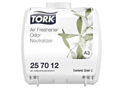 A Tork folyamatos adagolású légfrissítő, szagsemlegesítő termék olyan terekbe ajánlott, ahol konkrétan jelen lévő szagok megszüntetésére van szükség. A kellemetlen szagokat megszüntető anyag (és vele együtt egy kevés citromfű) nagy koncentrátumban van jelen: így megszűnnek a kellemetlen szagok, és a helyüket átveszi az állandó, friss illat. A Tork folyamatos adagolású légfrissítő adagolóval együtt használható: ezt az adagolót a takarító személyzet igazoltan egyszerűen tudja használni.