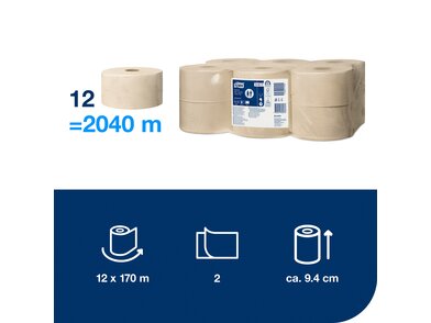 A Tork Mini Jumbo rendszer alapeleme a hatékony időkezelés és a költségcsökkentés: a hagyományos tekercseknél jóval több toalettpapírt biztosít. A 2 rétegű Tork Mini Jumbo toalettpapír tökéletes egyensúlyt teremt az ár és a minőség között. Közepes és nagy forgalmú helyiségekbe ajánljuk. A tissue papír 100%-ban újrahasznosított rostszálakból készült.