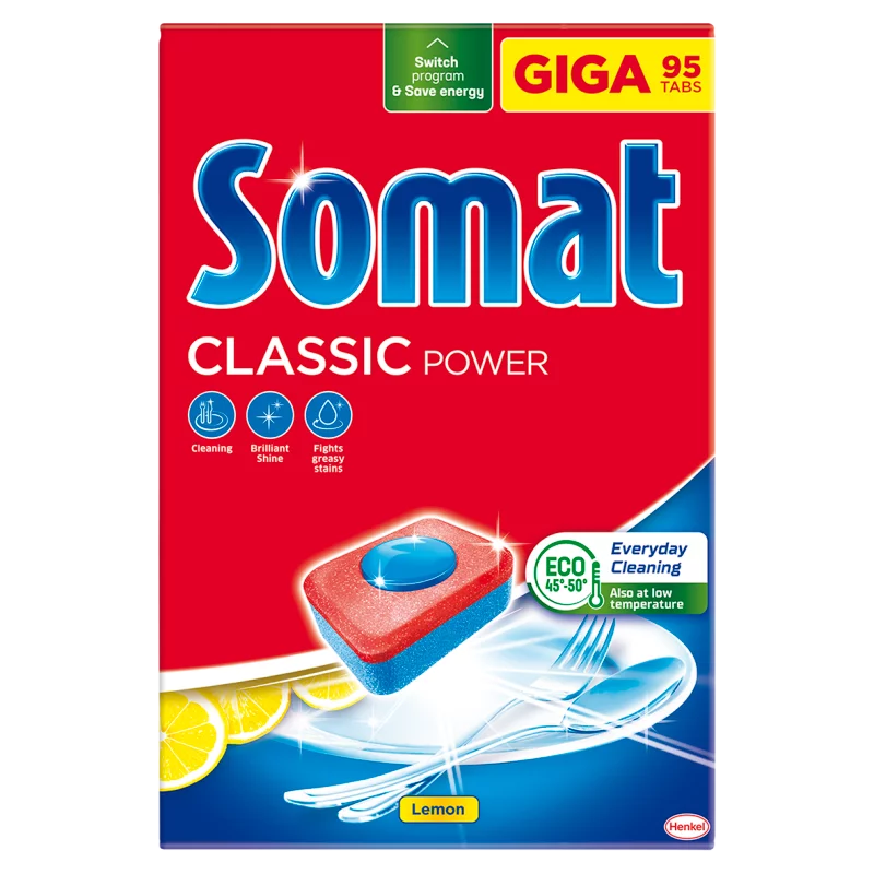Somat Classic Power Lemon mosogatógép tabletta kiváló választás minden háztartás számára, ahol a tiszta és csillogó edények elérése a cél. A tabletták hatékony formulája könnyedén eltávolítja a makacs szennyeződéseket és a zsírt, akár alacsony hőmérsékleten is, miközben kellemes citromillatot hagynak maguk után. A Somat Classic speciális összetevői segítenek a vízfoltok és a fehér lerakódások megelőzésében, így edényei mindig ragyogóak maradnak.